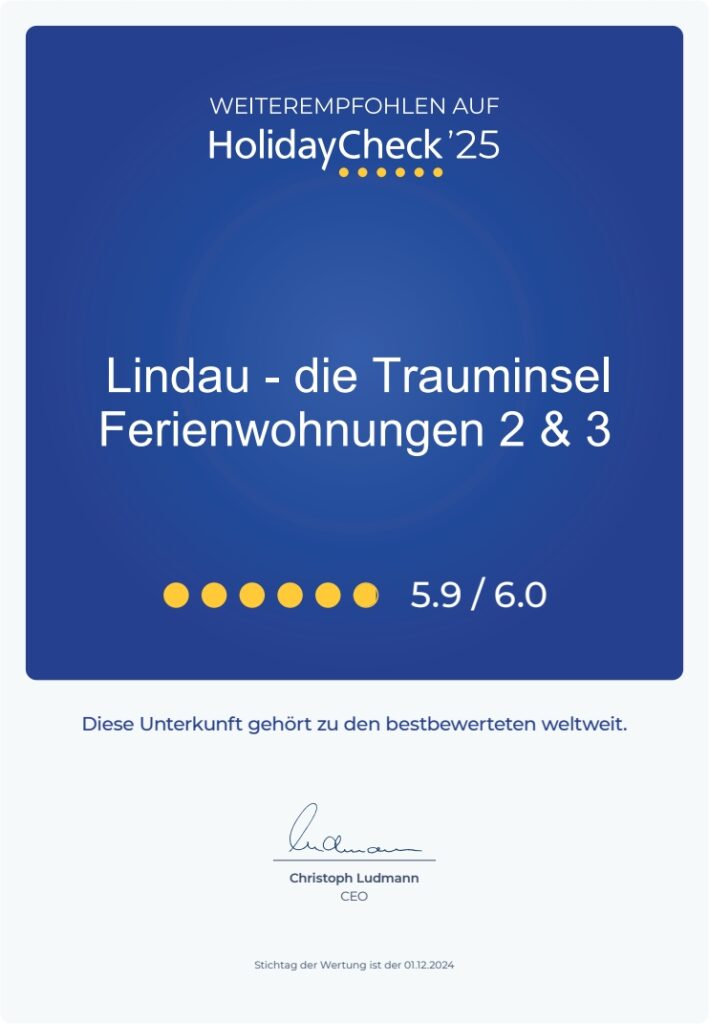 Alle zwei Ferienapartments wurden erneut in 2025 von HolidayCheck mit 5,9 Sternen ausgezeichnet. HolidayCheck ist das größte deutschsprachige Bewertungsportal für Reise und Urlaub im Internet – mit mehr als 12,6 Mio. Besuchern pro Monat. Booking.com hat Lindau die Trauminsel Nr. 2 mit dem Traveller Review Awards 2024 mit 9,2 von max. 10 Sternen ausgezeichnet.
