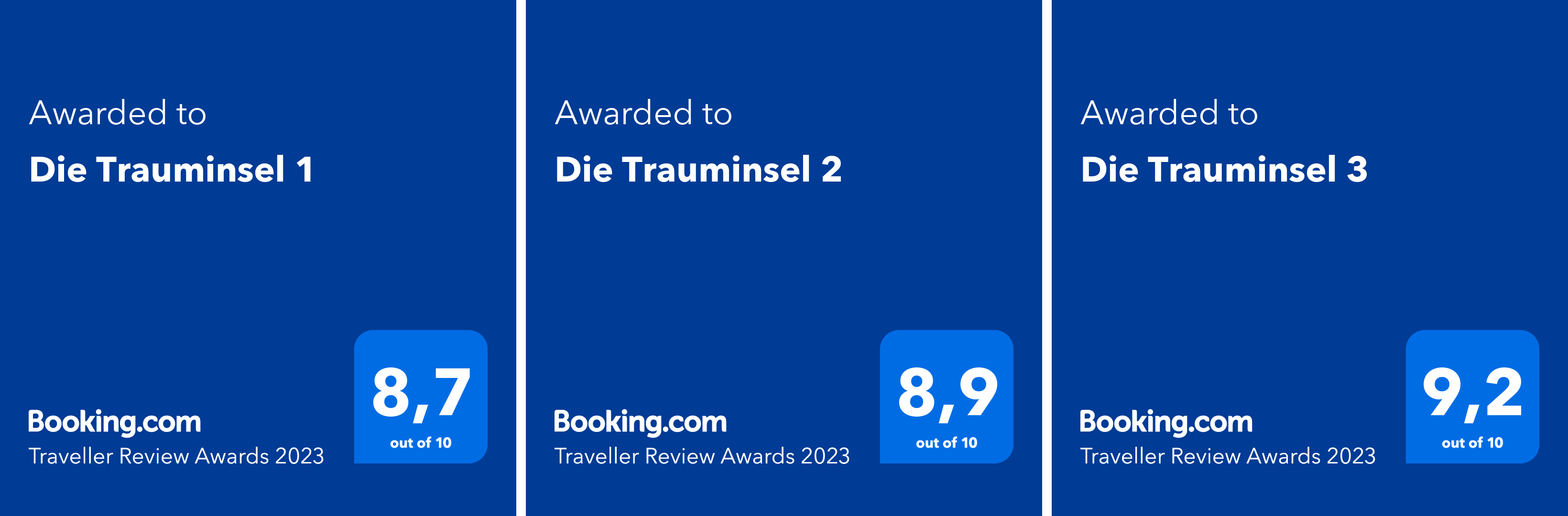 Alle zwei Ferienapartments wurden erneut in 2025 von HolidayCheck mit 5,9 Sternen ausgezeichnet. HolidayCheck ist das größte deutschsprachige Bewertungsportal für Reise und Urlaub im Internet – mit mehr als 12,6 Mio. Besuchern pro Monat. Booking.com hat Lindau die Trauminsel Nr. 2 mit dem Traveller Review Awards 2024 mit 9,2 von max. 10 Sternen ausgezeichnet.